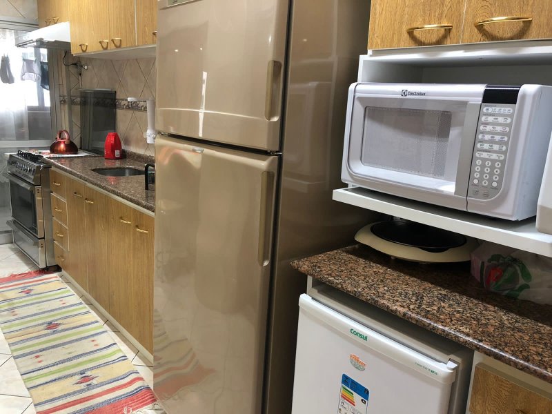 Vista parcial para o mar, mobiliado e equipado, 02 dormitórios sendo 01 suíte e uma dependência de empregada com banheiro, uma vaga de garagem privativa.