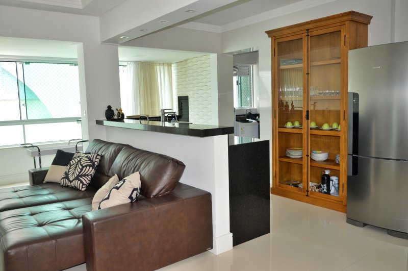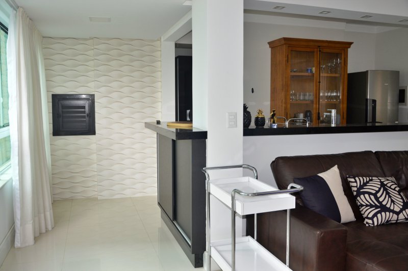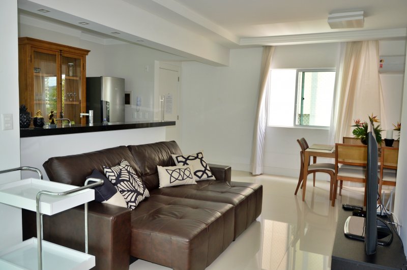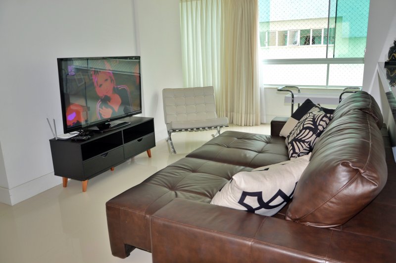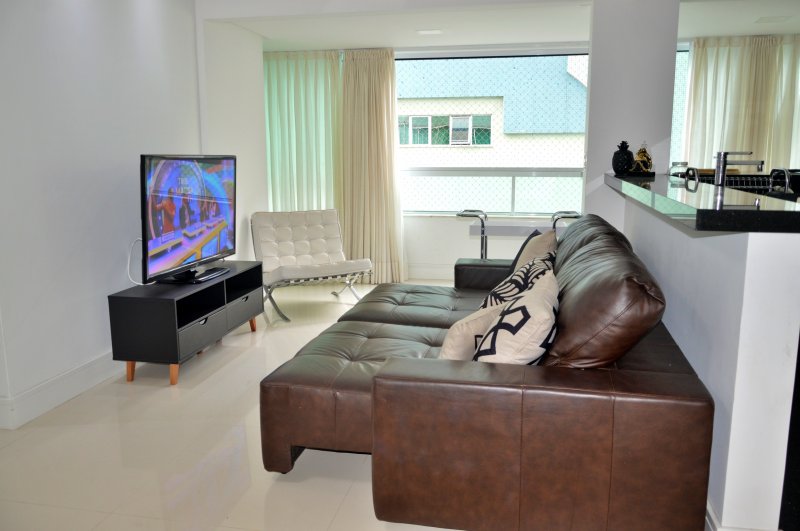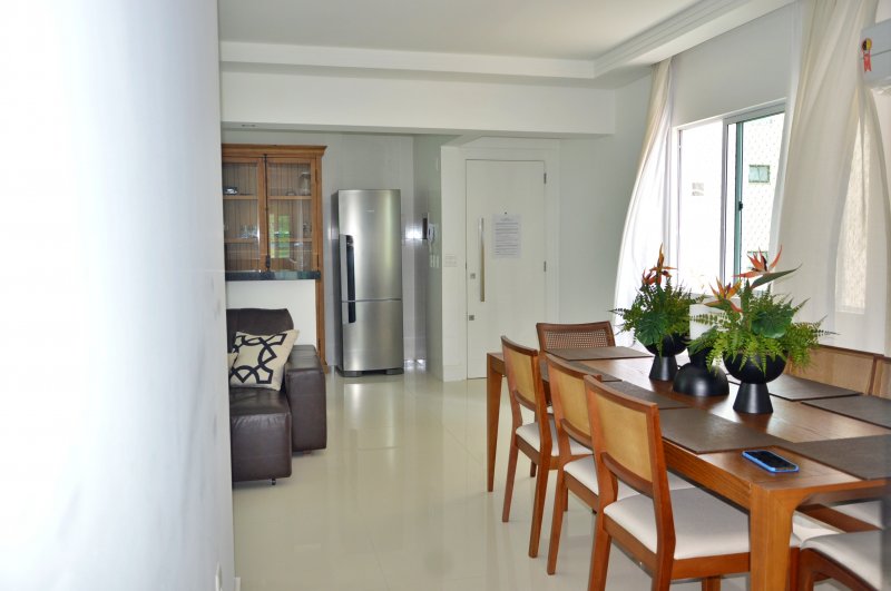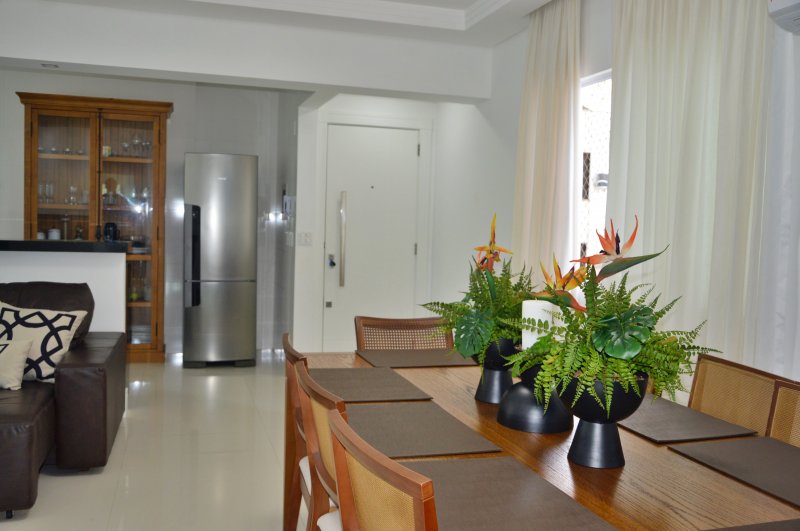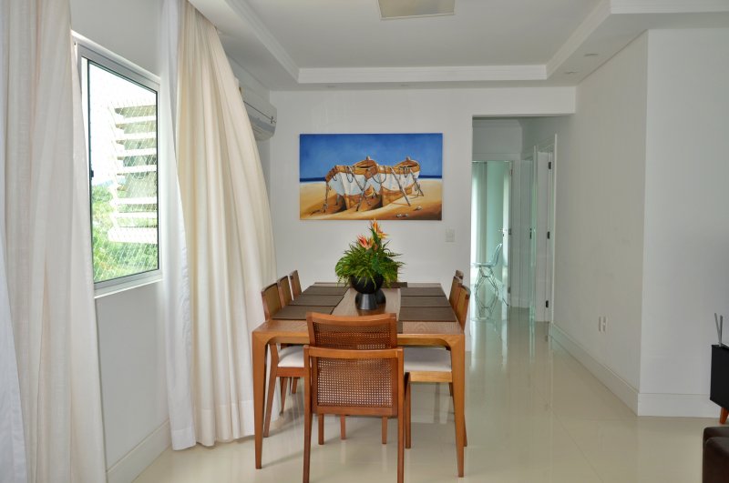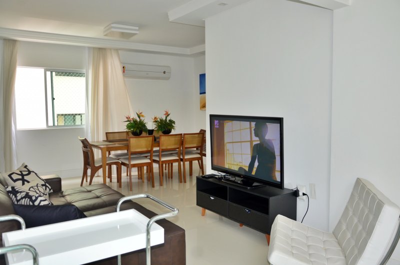 São três dormitórios sendo uma suíte e dois quartos (ar condicionado na suíte e em um quartos e no terceiro quarto ventilador de teto), uma sala ampla com dois ambientes e churrasqueira (climatizada), internet, itens de cozinha para o preparo de refeições e uma vagas de garagem no mesmo prédio.