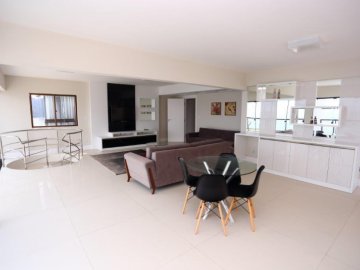 Sobre o acabamento esta cobertura apresenta piso em porcelanato, móveis sob medida, teto rebaixado em gesso, e conta ainda com ambientes climatizados e equipados com alguns eletrodomésticos.