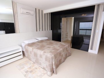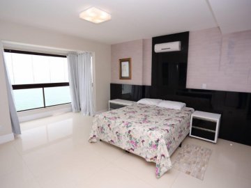 Cobertura duplex frente mar a venda com 5 suítes, sendo 2 suítes no piso inferior e 3 no piso superior e 2 delas com closet e vista para o mar, lavabo, dependência de empregada com banheiro, área de serviço, sacada com vista para o mar, living integrado com cozinha, sala de jantar, sala de Tv e sala de estar.