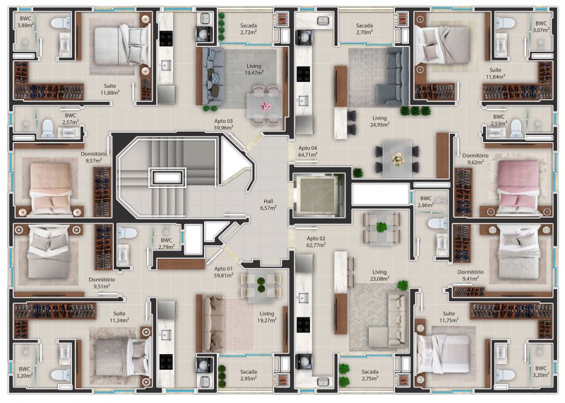 - Área Privativa: 62,77 m²